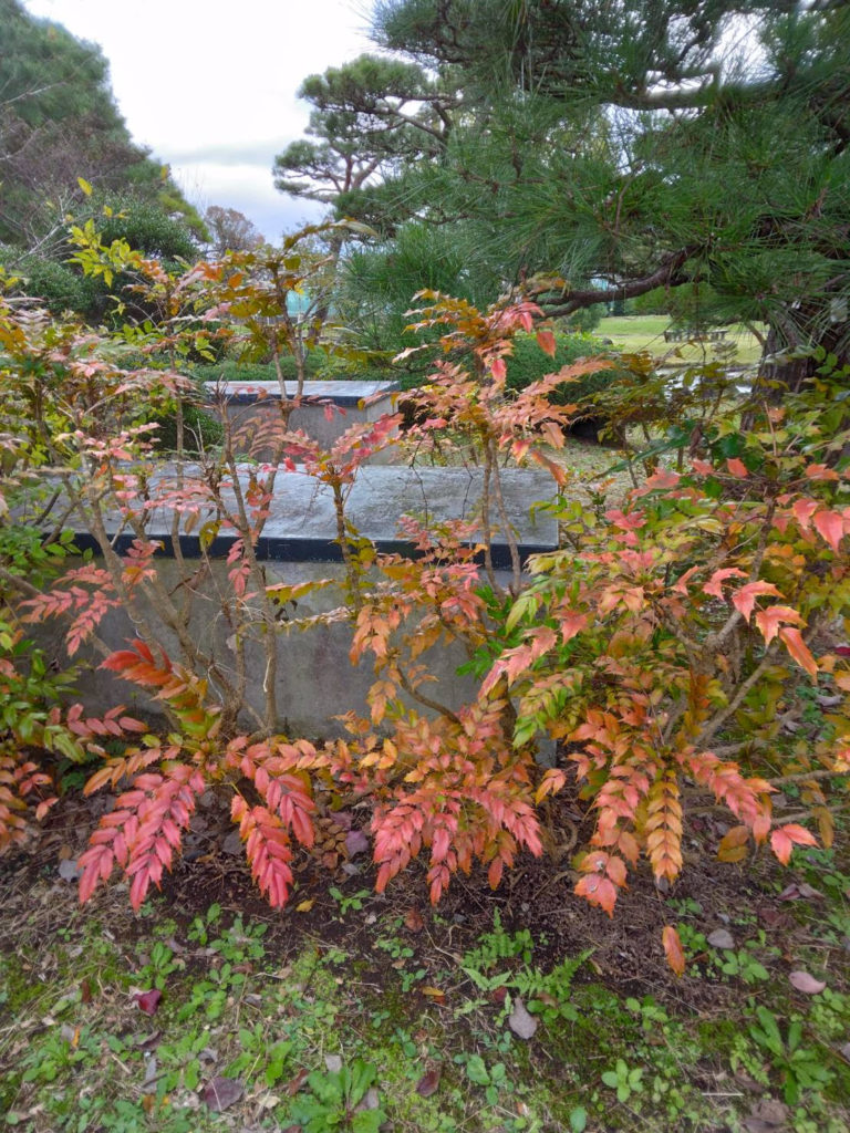 先日ハナミズキの葉が真っ赤に色づいているのを見ました。ふと視線を下に向けたら、緑の中に赤、黄と色づいた低木を見つけました。